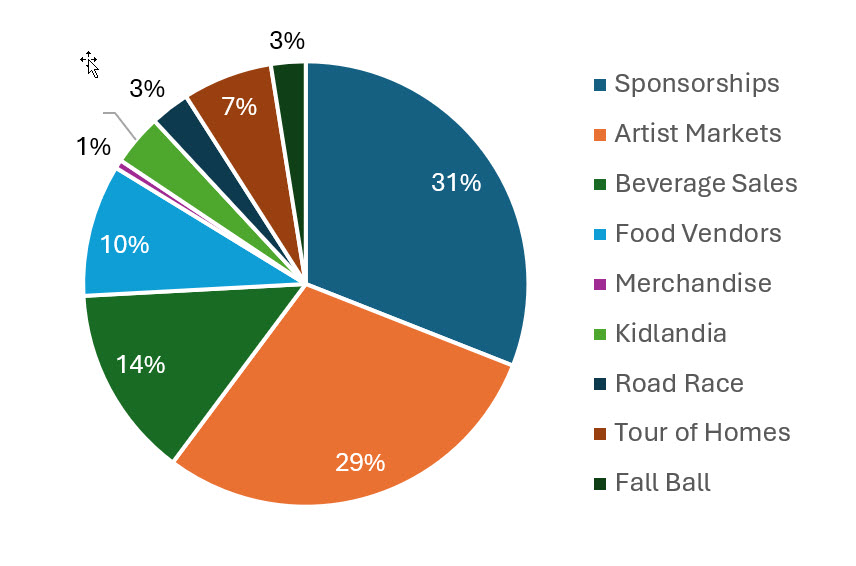 Pooling over these 11 years, the most revenue has come from general sponsorships and the artist markets followed by beverage sales and food vendors, for a total of 84%. The remaining 16% represents profits from merchandise, kidlandia, and the Road Race, Tour of Homes, and Fall Ball (Fall Ball contributed only the last three years).