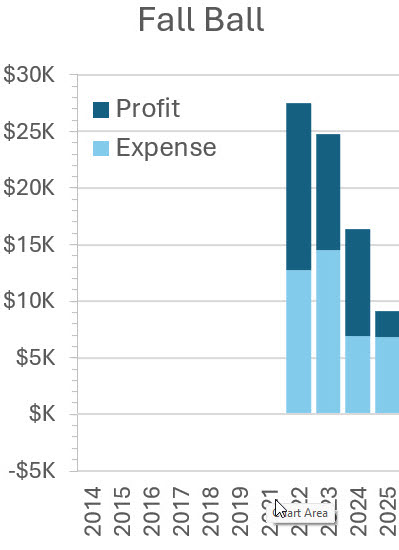 In In this figure, the dark blue portion at the top of these bars indicates profit (most years). The red portion at the bottom indicates loss (2014 and 2021). For years with a profit, the height of the bar indicates income and the light blue portion indicates expenses. For years with a loss, the light blue portion indicates income and the entire bar (including the red portion) indicates expenses.