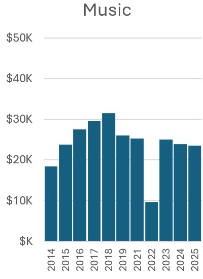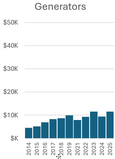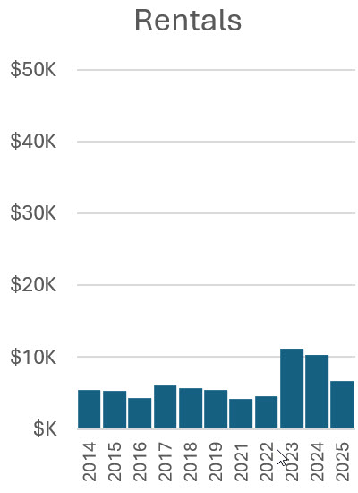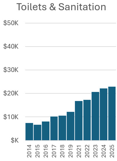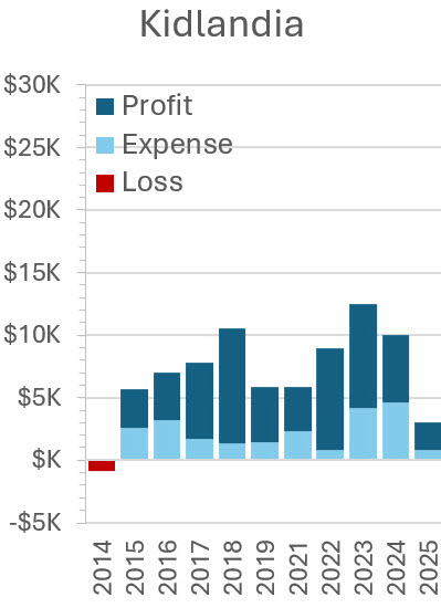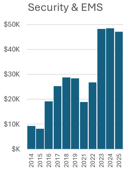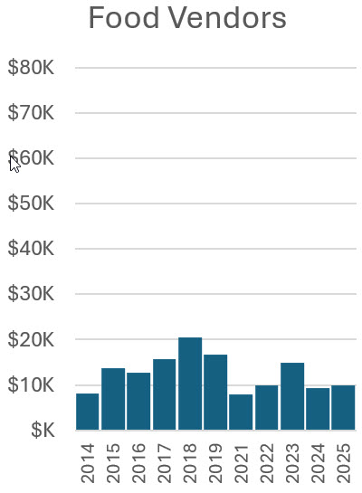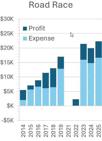 These figures show the expenses year by year for sources not associated with specific income. Noteworthy are increases in security and toilets, especially since 2023 for security, and the relative stability of other costs. Expenses for sources associated with specific income (merchandise, kidlandia, road race, tour of home, and fall ball) are shown in the earlier figures indicating their profits.