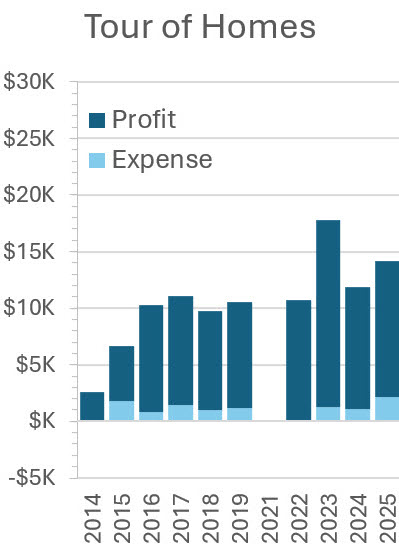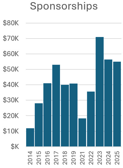 These figures show the revenue year by year for the four major sources of income. Sponsorships are general for Fall Fest and not for a specific activity or event (like Tour of Homes or Fall Ball).